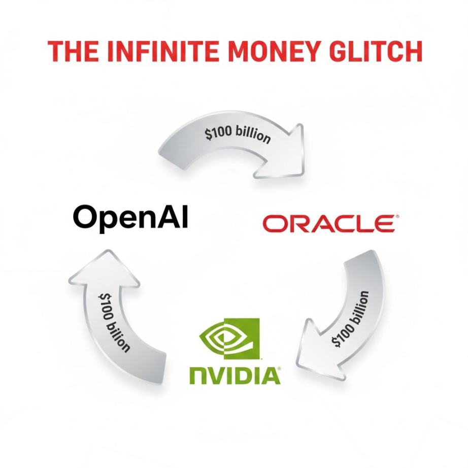 单一公司的财务压力仅是冰山一角。当我们将视角从甲 Oracle 放大至整个 AI 生态系统时,一个更深层次、结构性的风险便浮出水面。真正的风险根植于 AI 行业巨头之间一种独特的资本运作模式,一种看似能点石成金,实则极其脆弱的金融游戏。这就是被称为「无限金钱循环」的封闭式资本游戏,它凭空吹大收入泡沫,构建出一个看似繁荣却不堪一击的金融体系。