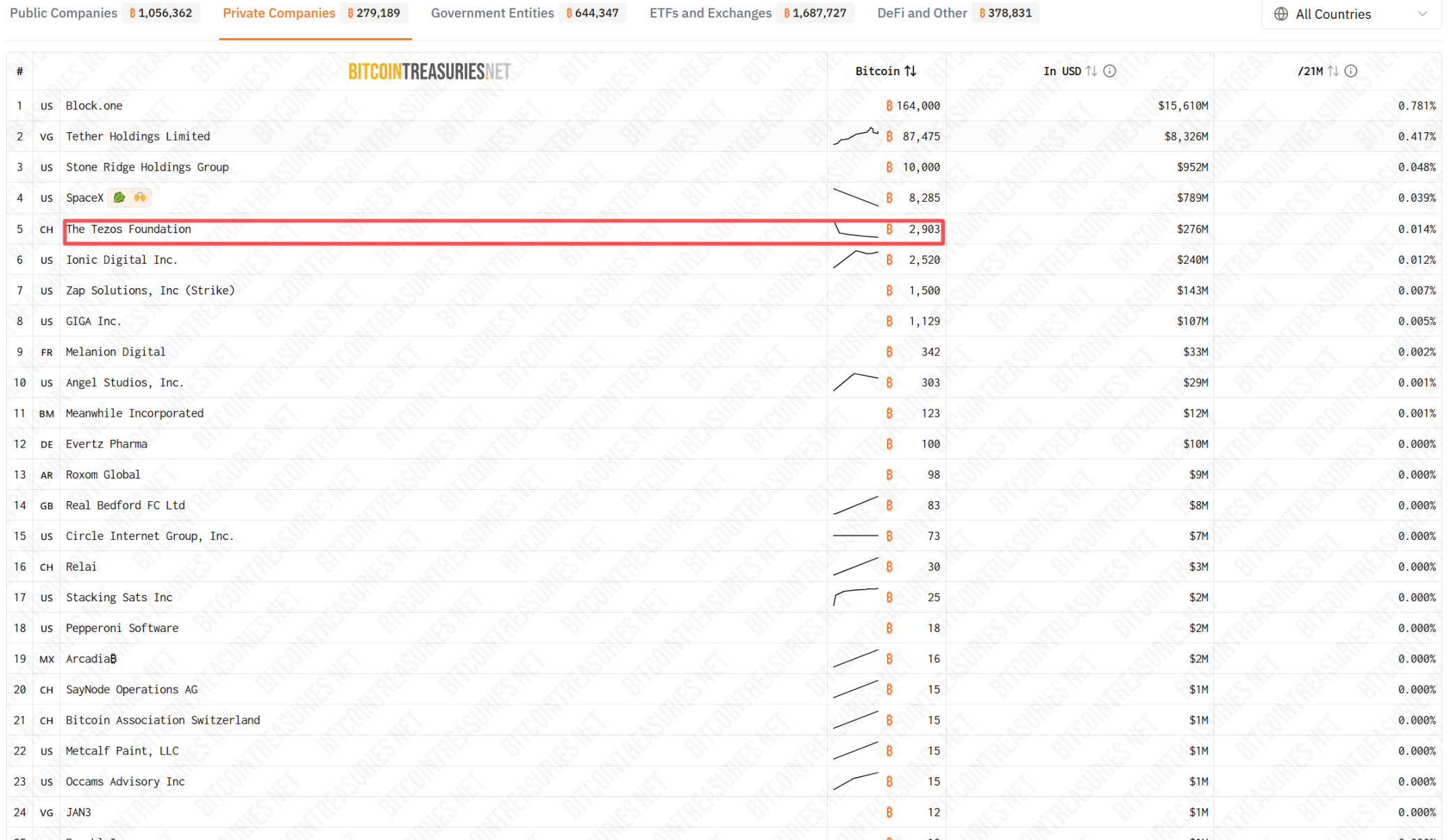 bitcointreasuries 数据显示,在 BTC 储备的 TOP 20 私企中,仅 Tezos 基金会选择了减持 BTC,其余选择增持或维持不动。