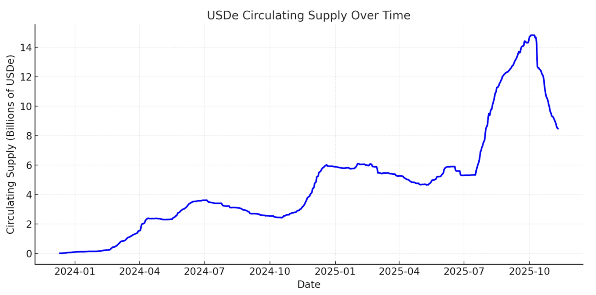 一项在 2024 年 11 月引入的费用开关提案概述了在价值可以流向 ENA 持有者之前需要达到的几个里程碑。所有这些条件在 10 月 10 日崩盘前都已满足。目前唯一低于其目标的指标是 USDe 的流通供应量,我们预计在费用开关激活之前,流通供应量将超过 100 亿美元。风险委员会和社区目前正在审查费用开关的实施细节。