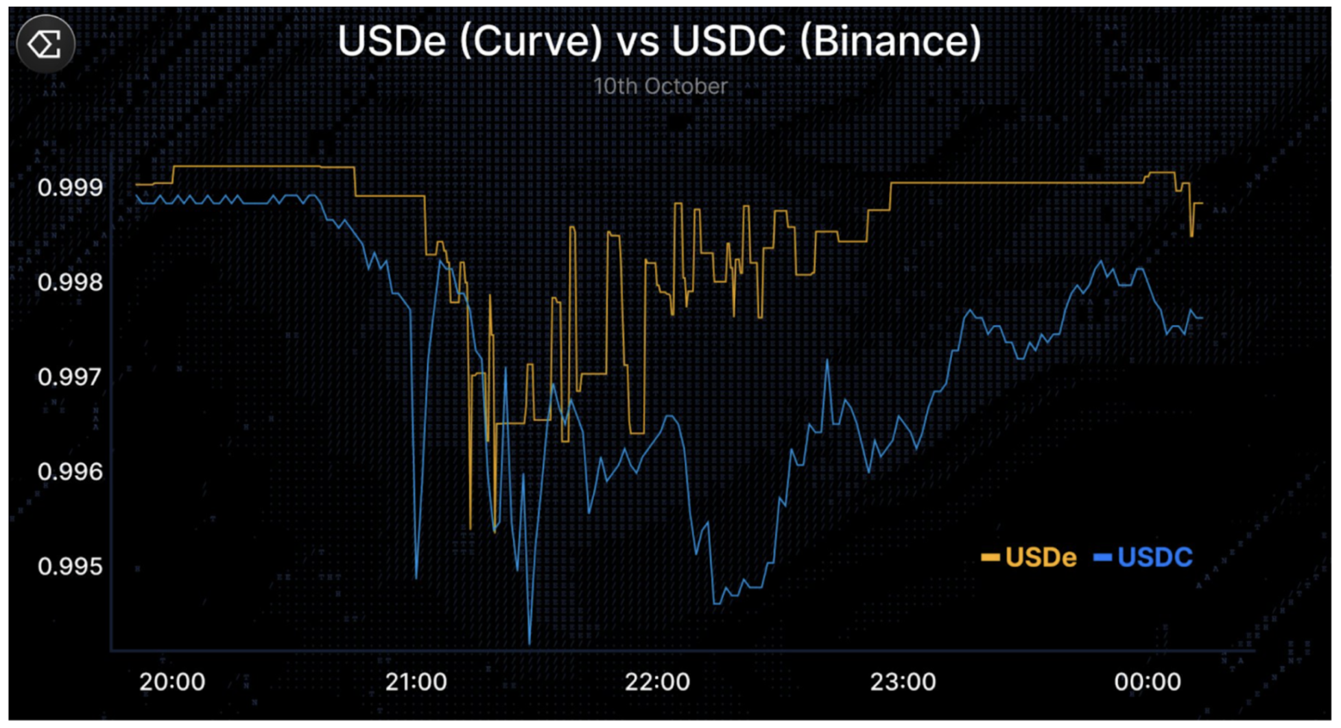 2025 年 10 月 10 日,加密市场经历了一次极端的去杠杆化事件,随着主要 CEX 和 DEX 的未平仓合约崩溃,数小时内约有 200 亿美元的头寸被清算。在连锁清算过程中,由于 Binance 的预言机设计,USDe 在 Binance 上短暂交易至低至约 0.65 美元,这引发了批评。然而,USDe 在更具流动性的链上场所(如 Curve)上保持接近平价(参见下图),并且赎回功能继续正常运作,表明这是特定场所的错位,而非系统性的脱锚。Guy 在 X 上的这条推文是理解 10 月 10 日事件的绝佳阅读材料。