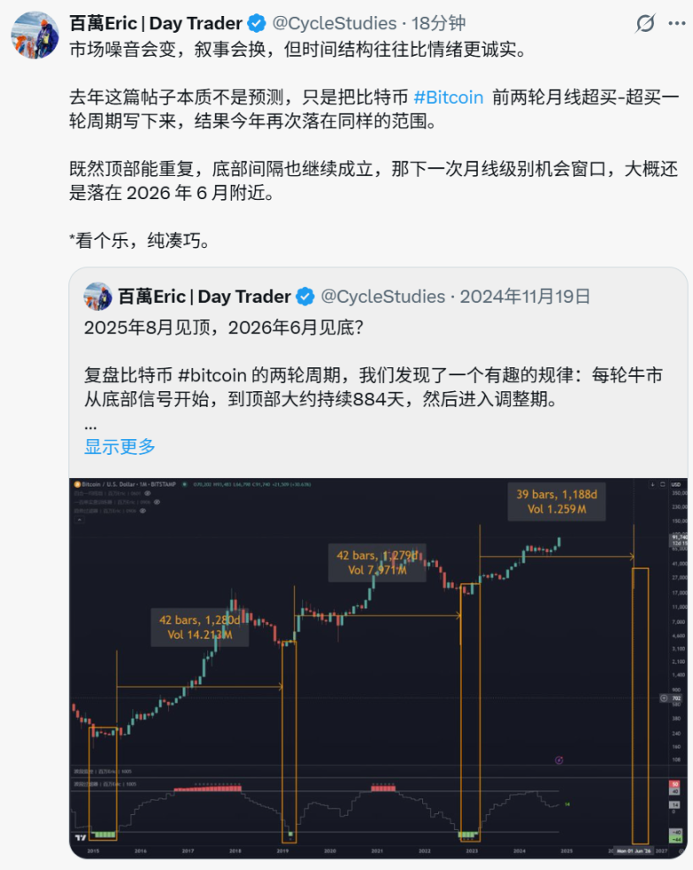 交易员百万 Eric 发推表示,市场噪音会变,叙事会换,但时间结构往往比情绪更诚实。去年这篇帖子本质不是预测,只是把比特币前两轮月线超买 - 超买一轮周期写下来,结果今年再次落在同样的范围。既然顶部能重复,底部间隔也继续成立,那下一次月线级别机会窗口,大概还是落在 2026 年 6 月附近。