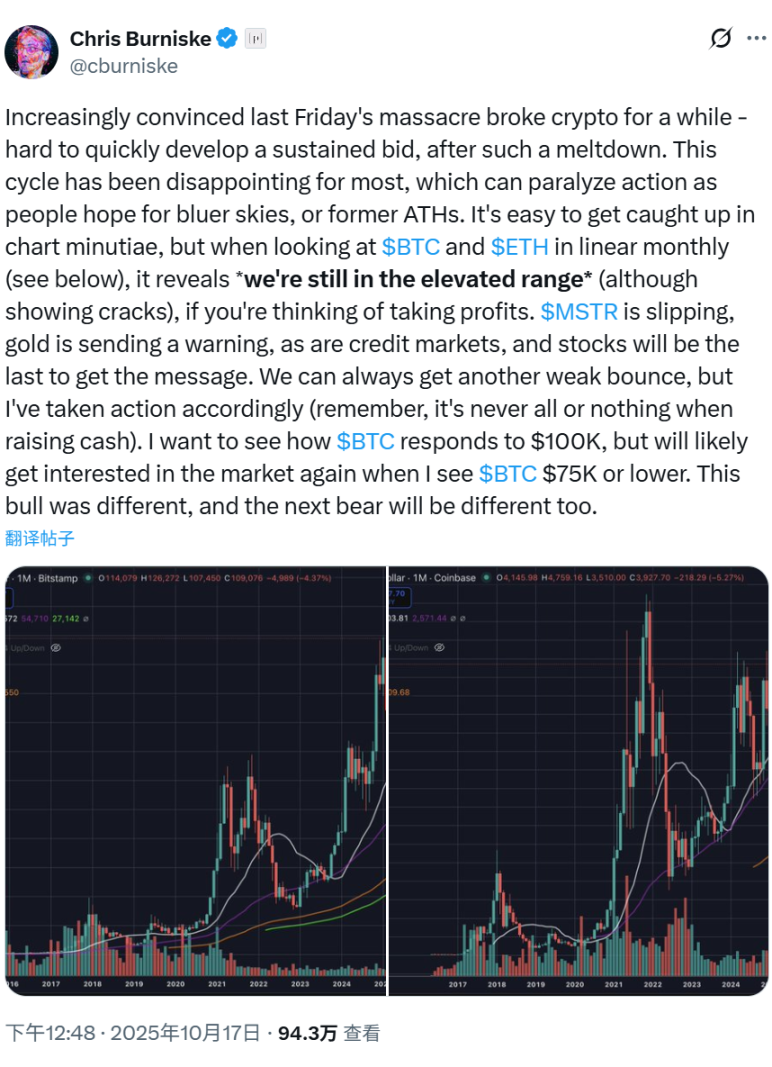 早在 10 月 17 日,Placeholder 合伙人 Chris Burniske 发推表示,「越来越确信 10 月 11 日的暴跌导致加密市场一度崩溃。在如此惨烈的暴跌之后,很难迅速形成持续的买盘。人们很容易被图表细节所困扰,但当你以月线图的形式查看 BTC 和 ETH 时,它表明我们仍处于高位区间(尽管出现了裂缝),如果你想获利了结的话。MSTR 正在下滑,黄金和信贷市场都在发出警告,而股市将是最后收到这一信息的。我们随时可能再次出现微弱的反弹,但我已经采取了相应的行动。我想看看比特币对 10 万美元点位的反应,但当我看到比特币跌至 7.5 万美元或更低时,我可能会再次对市场产生兴趣。这轮牛市不同以往,下一轮熊市也将有所不同。」