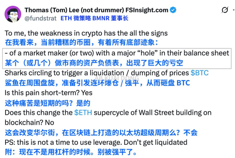 比特币跌破 10 万美元、以太坊一周跌去一成,加密市场在 11 月中旬再度上演「多军死亡螺旋」。以太坊储备第一机构 BitMine 董事长、华尔街分析师 Tom Lee 认为,真正的压力来自做市商流动性缩水与大型交易者的套利抛售。