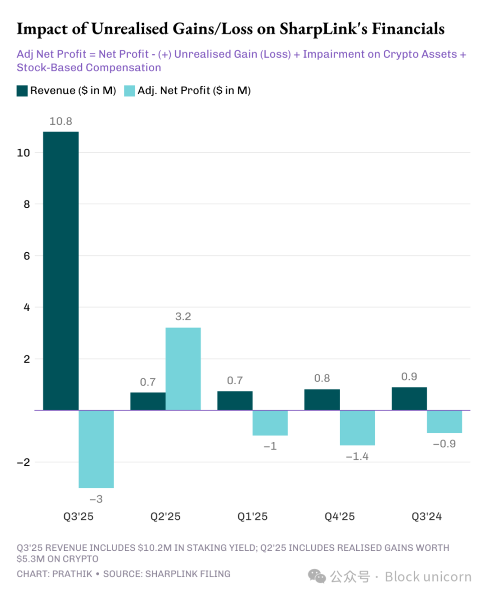 本季度,SharpLink 近 95% 的收入都来自其 ETH 质押所获得的收益。虽然其净利润飙升 100 倍,达到 1.043 亿美元,而 2024 年第三季度则净亏损 90 万美元,但这其中却隐藏着一个问题。与其他大多数 DAT 项目一样,SharpLink 的全部利润都来自其持有的 ETH 的未实现收益。