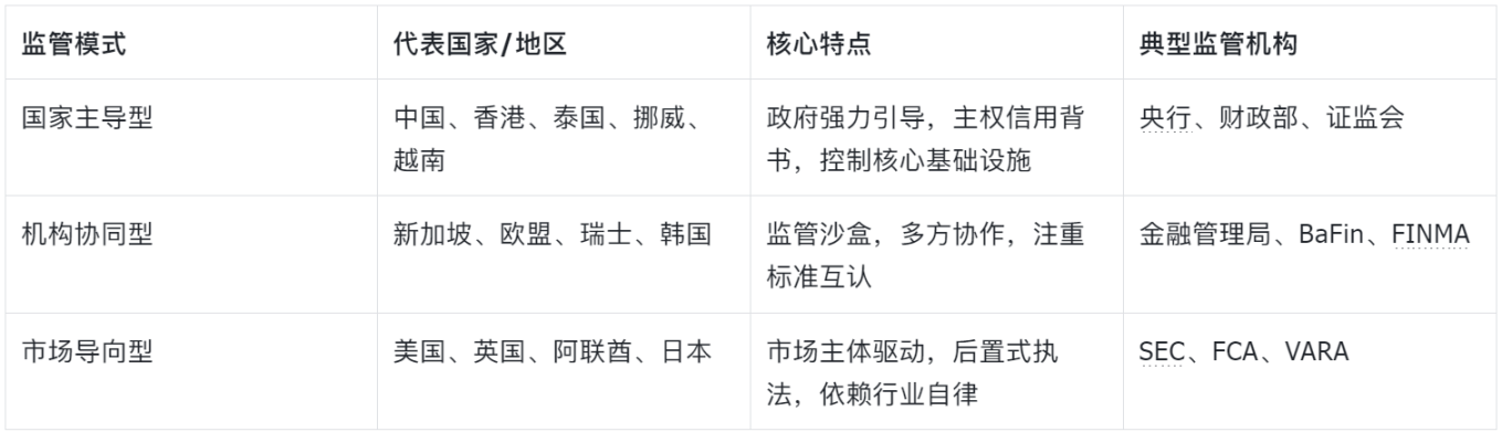 这三种监管模式的形成深受各地区金融传统、法律体系和产业政策影响。国家主导型常见于政府对金融市场有较强引导能力的地区;机构协同型则多为高度依赖国际贸易与金融合作的开放型经济体;市场导向型通常是金融市场高度发达、监管体系成熟的司法管辖区。