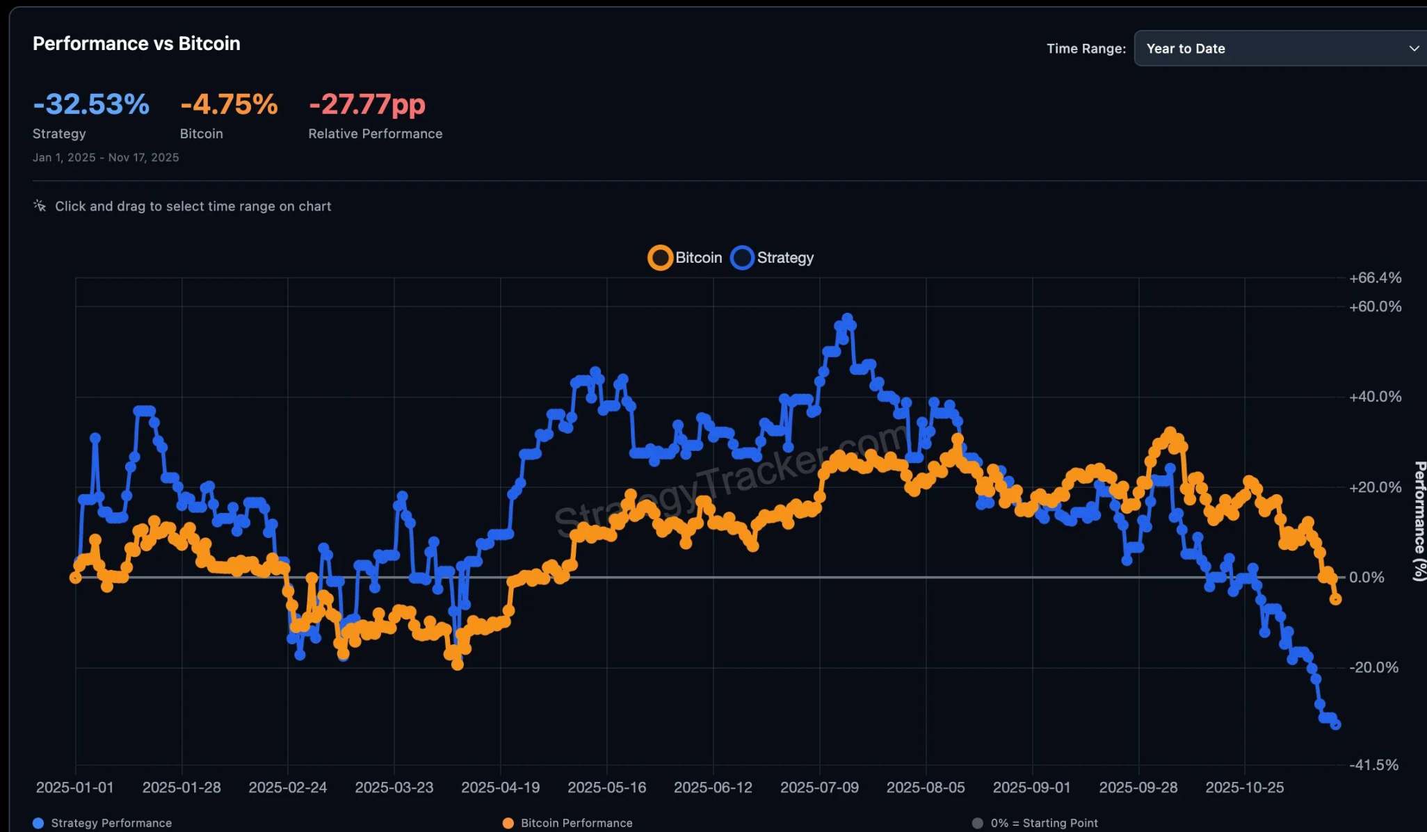 从今年年初算的话,BTC 只跌了 4.75%,但 MSTR 股价已经跌了 32.53%。