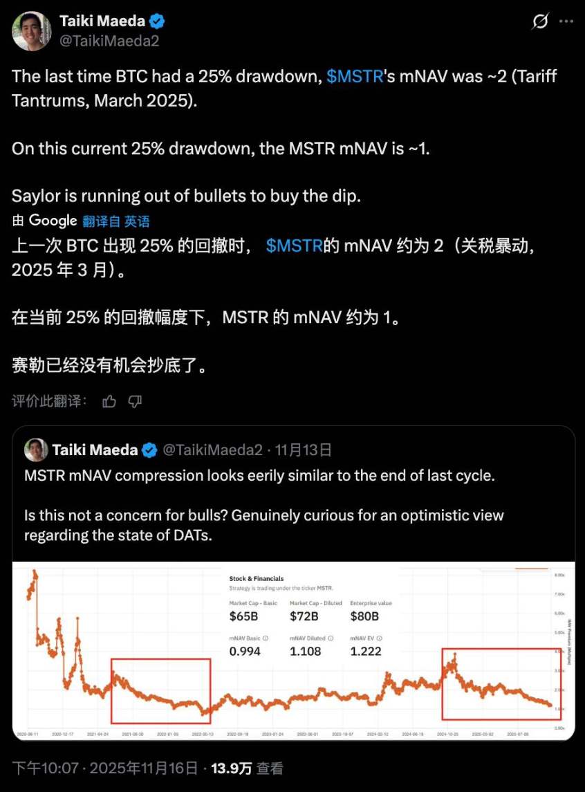 但当 BTC 大跌,加上 mNAV 跌破 1,这个循环就没有以前那么丝滑了。