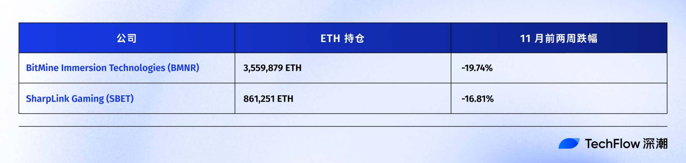 这些公司把 ETH 作为财库主要资产。11 月前两周,ETH 价格从 $3,639 跌至 $3,120(-14.3%),但它们的股价跌幅达到 17-20%。