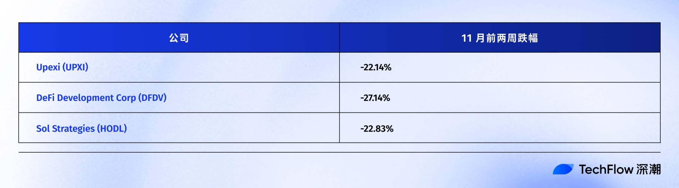 这些公司都是比特币矿工 + 财库模式,11 月前两周,BTC 跌了约 15%,但它们的股价跌幅都超过 30%。