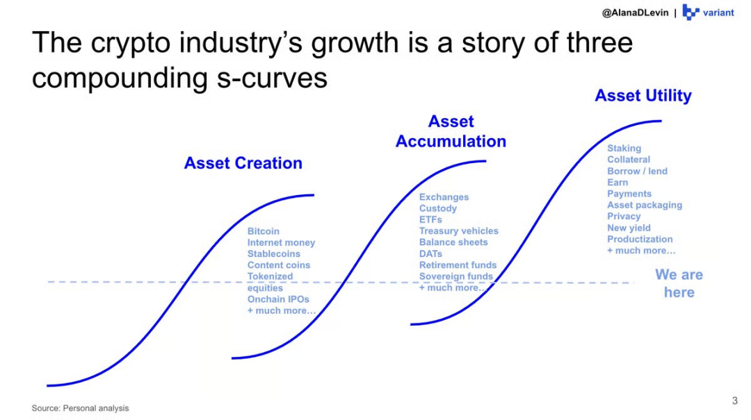 加密货币行业的发展可解读为三条相互叠加的「S 型增长曲线」演进过程,分别对应:资产创造、资产积累与资产利用三个阶段。