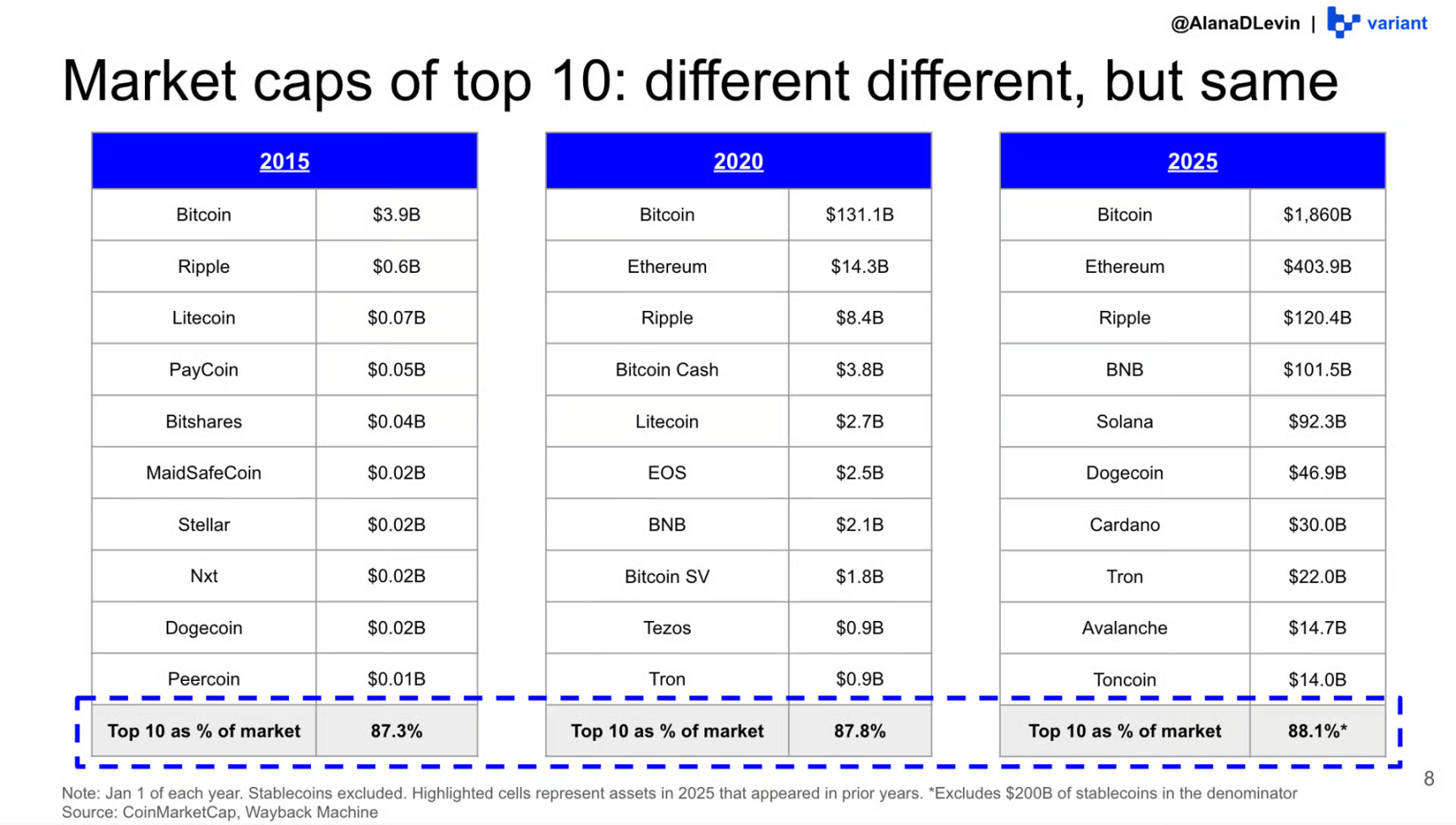 注:这是 2015、2020、2025 年加密货币市值 Top10 数据,比特币等头部占比超 87% ,长期主导市场。