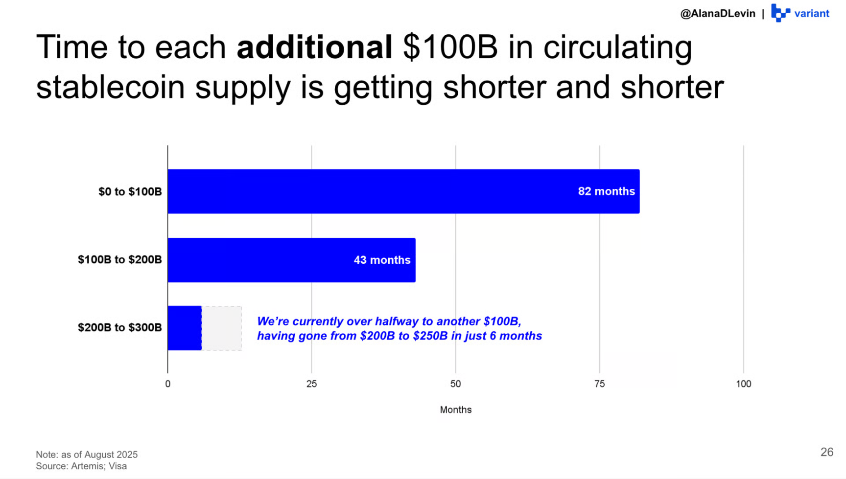 注:这是稳定币供应增长速度图表,每新增 1000 亿流通量,所需时间不断缩短,发展呈加速态势 。
