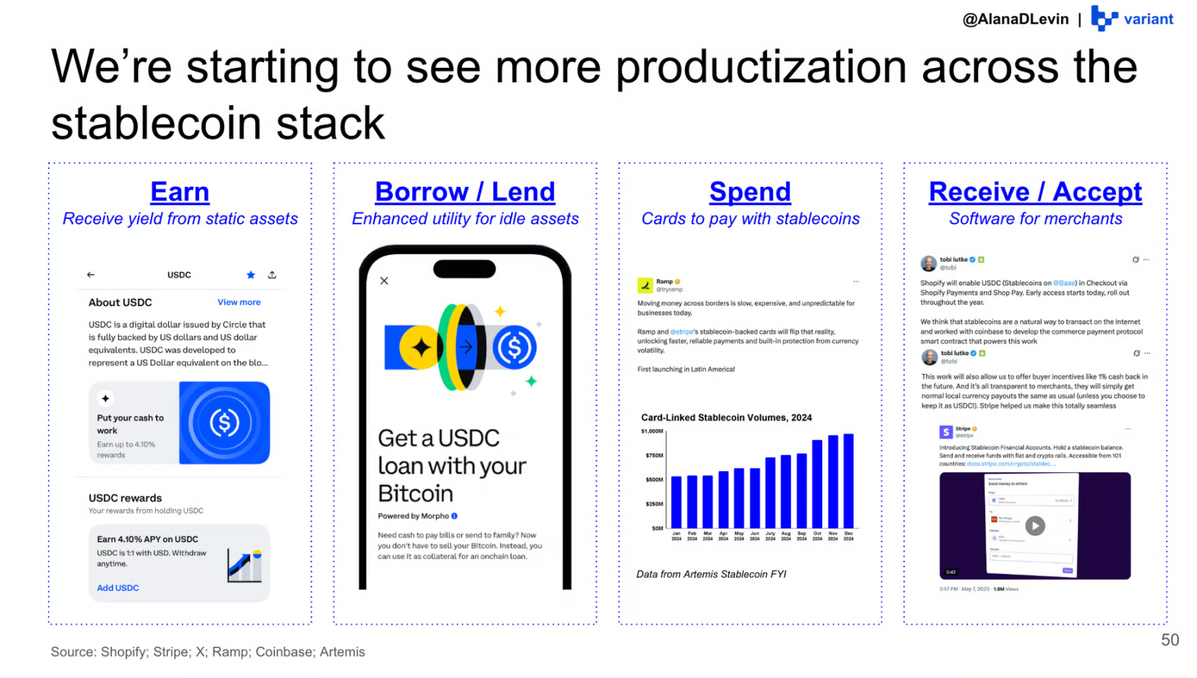 注:该图呈现稳定币应用场景产品化趋势,从赚取收益、借贷、消费到接收,展示其多元生态实践 。