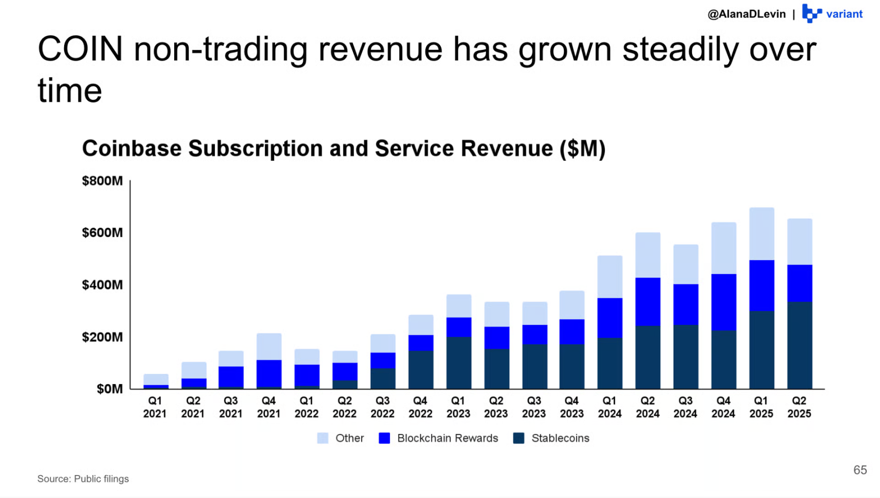 注:这是 Coinbase 非交易收入(订阅和服务收入)增长图,2021 - 2025 年多板块驱动,呈稳步上升趋势 。