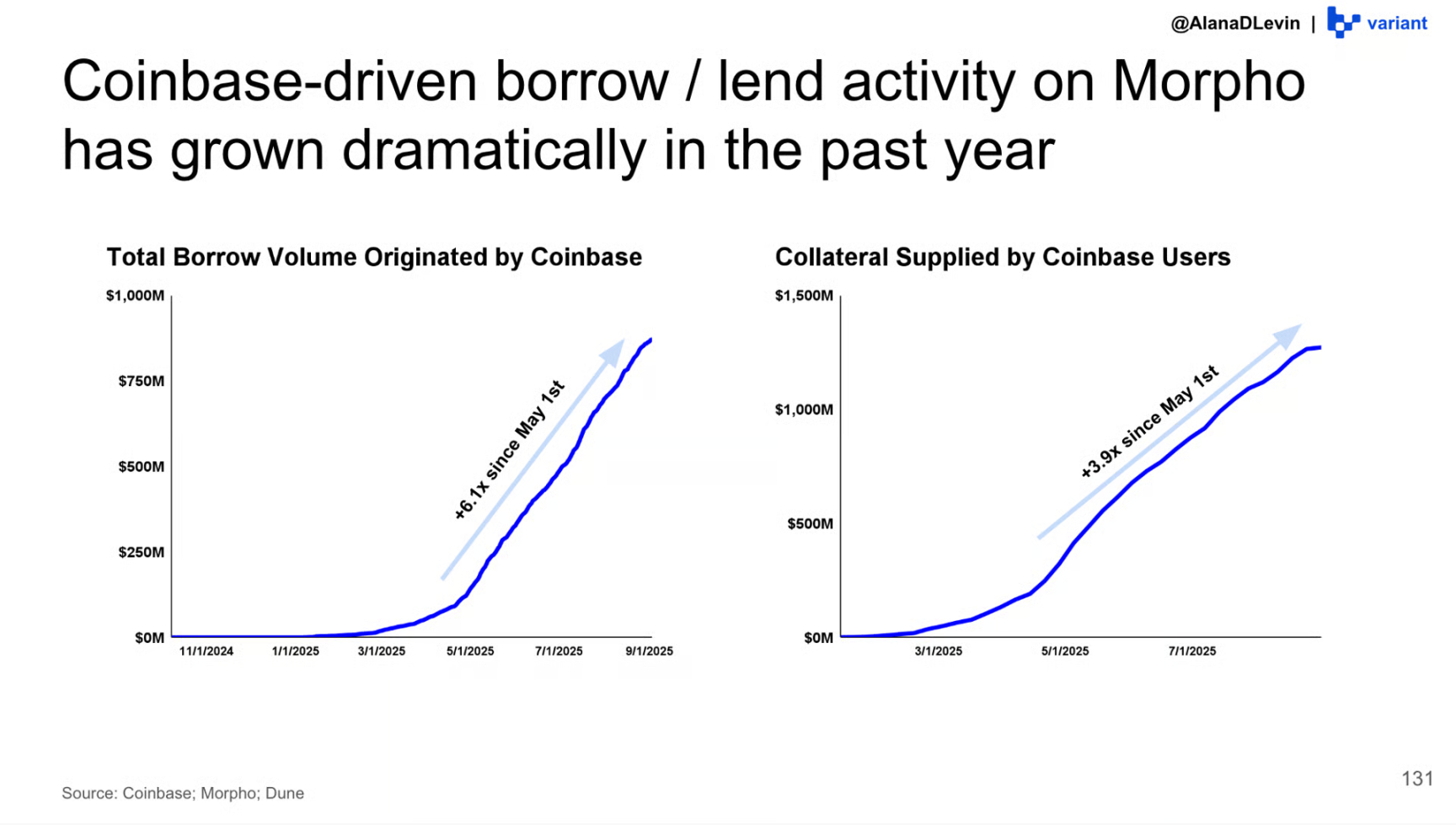 注:图表展示 Coinbase 在 Morpho 上的借贷活动,过去一年借款量、抵押品供应均大幅增长,5 月后增速显著 。