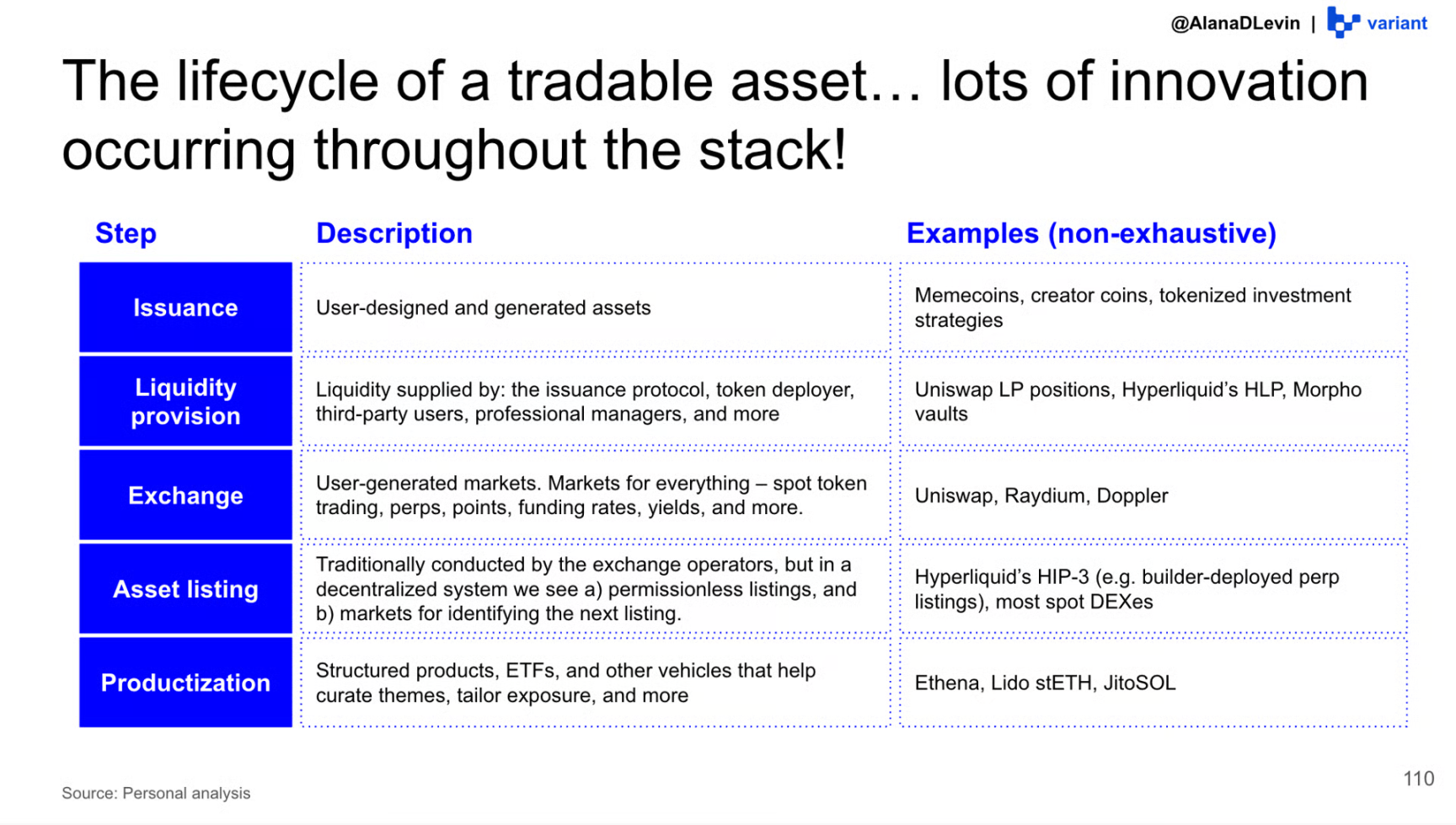 注:这是可交易资产的生命周期图,从发行、流动性供应到产品化,每一步都有创新和实例 。