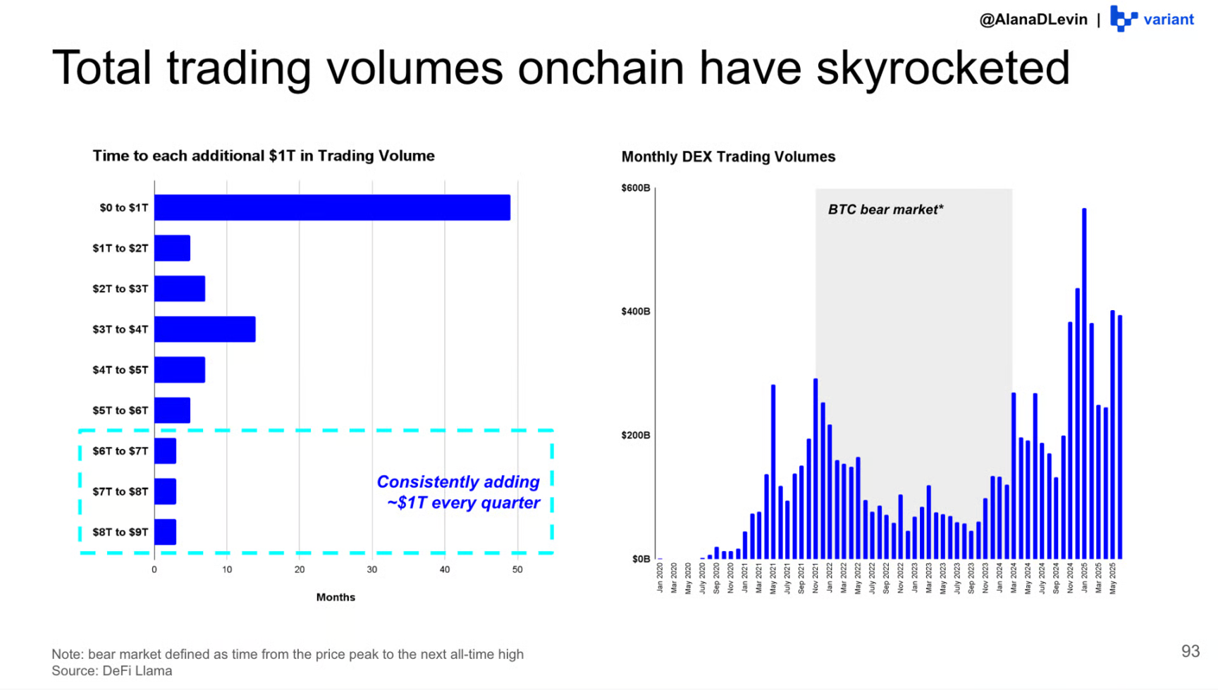 注:这是链上总交易量图表,显示新增 1 万亿交易量耗时缩短,季度增约 1 万亿,去中心化交易月量也攀升。