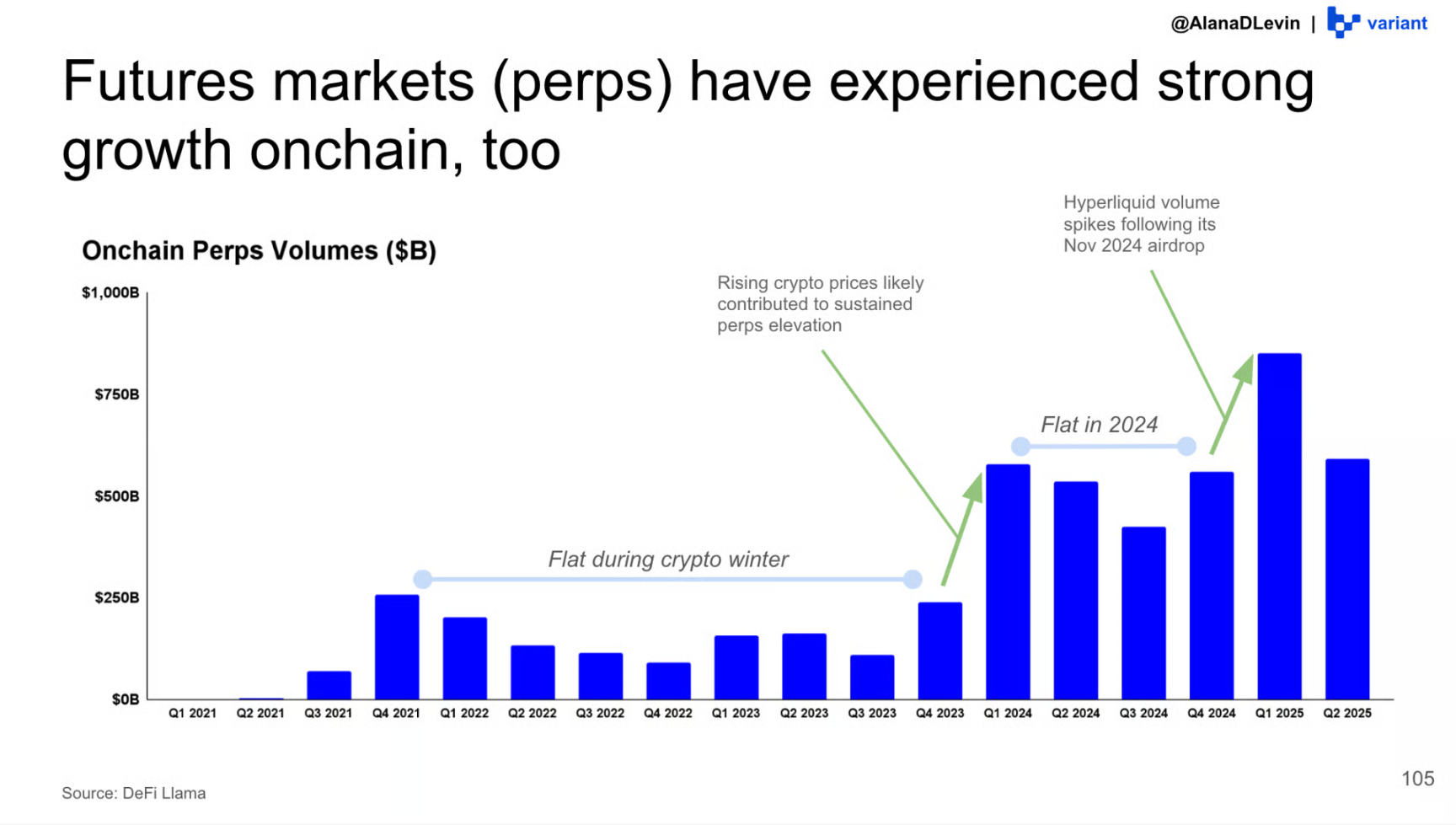注:该图呈现链上永续期货市场交易量变化,经历加密寒冬后,2024 年起增长显著,受价格及项目影响有波动 。