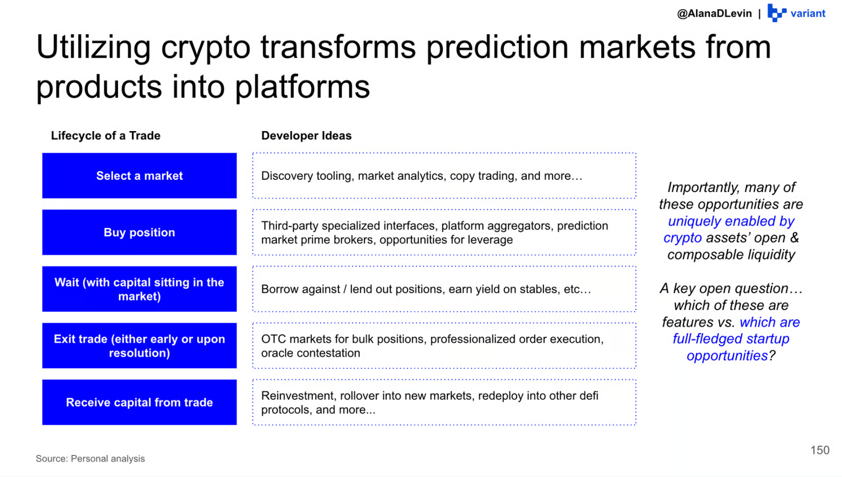 注:该图展示加密货币如何将预测市场从产品转为平台,呈现交易生命周期及开发者可探索的创新方向 。