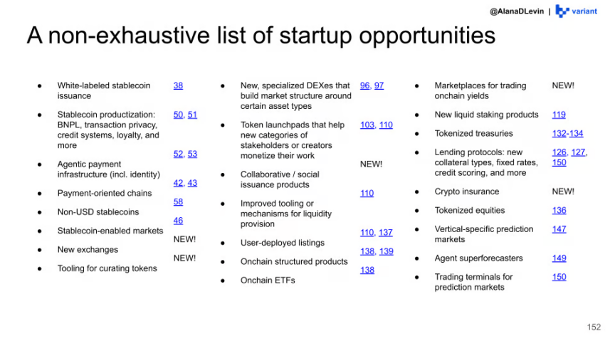 注:这是 Variant 机构整理的加密货币领域创业机会清单,涵盖稳定币、支付、交易、借贷等多方向,为从业者提供思路 。