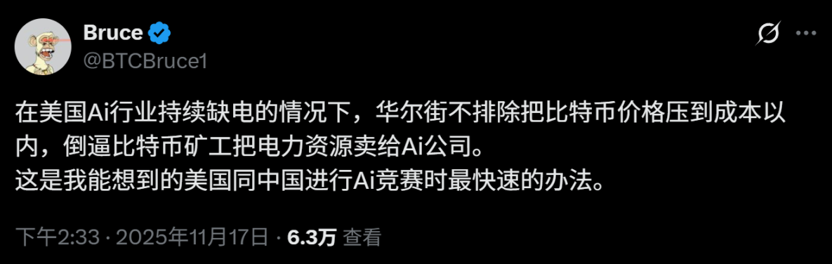 与此同时,近期关于 BTC 关机价、矿企出清与周期性洗牌的讨论讨论也开始浮现,不过和以往不同的是,本轮讨论的核心假设已不再是 Crypto 内部供需,而是来自于一个更宏观的新事实:AI 与 Crypto 已站在同一个能源池子里争夺电力。