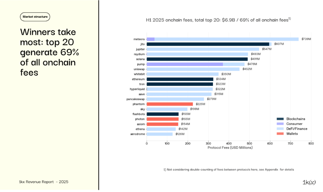 头部 20 大协议的费用占比从 2021 年下半年的 94% 下降至 2025 年上半年的 69%:
