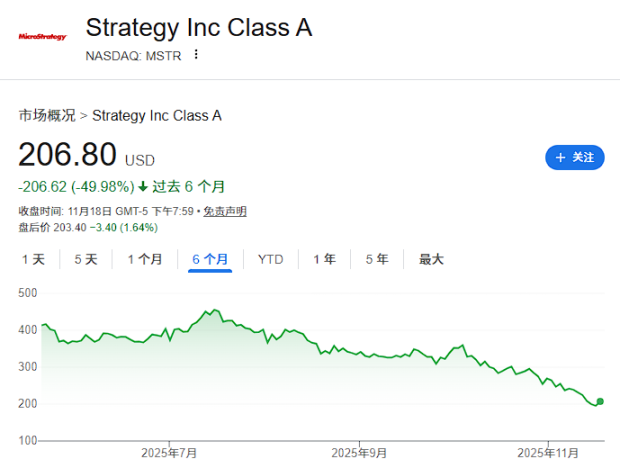 持有并存储比特币的公司股价更是陷入严重困境。其中规模最大的 Strategy(前身为 MicroStrategy)今年股价下跌超过 30%,较夏季高点跌幅超过 50%。