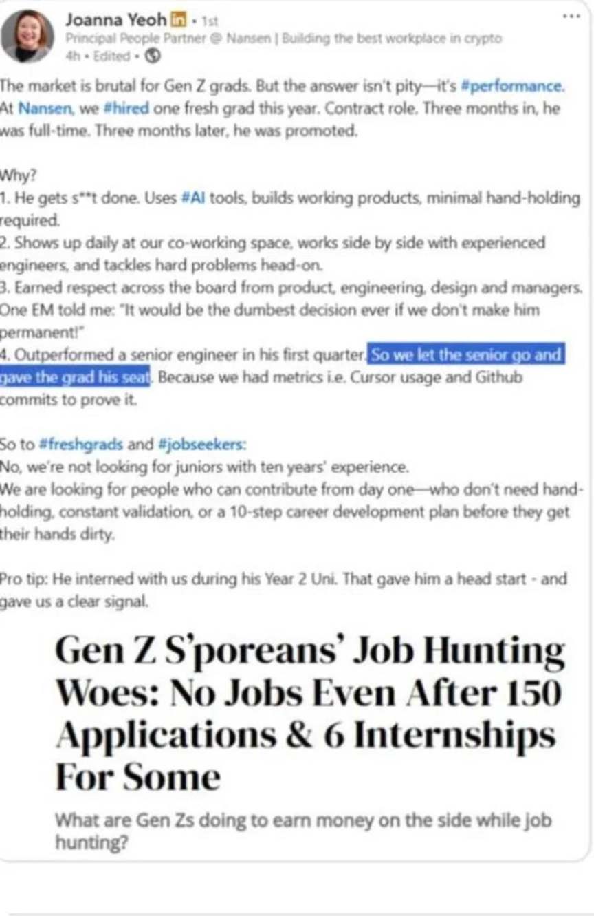 根据匿名用户分享的截图(同时也在 subreddit r/singaporejobs 上流传),杨在帖子中提到,这位应届毕业生在三个月内「超越了一位资深工程师」,随后这名资深员工被解雇,而「这位毕业生接替了他的职位」。