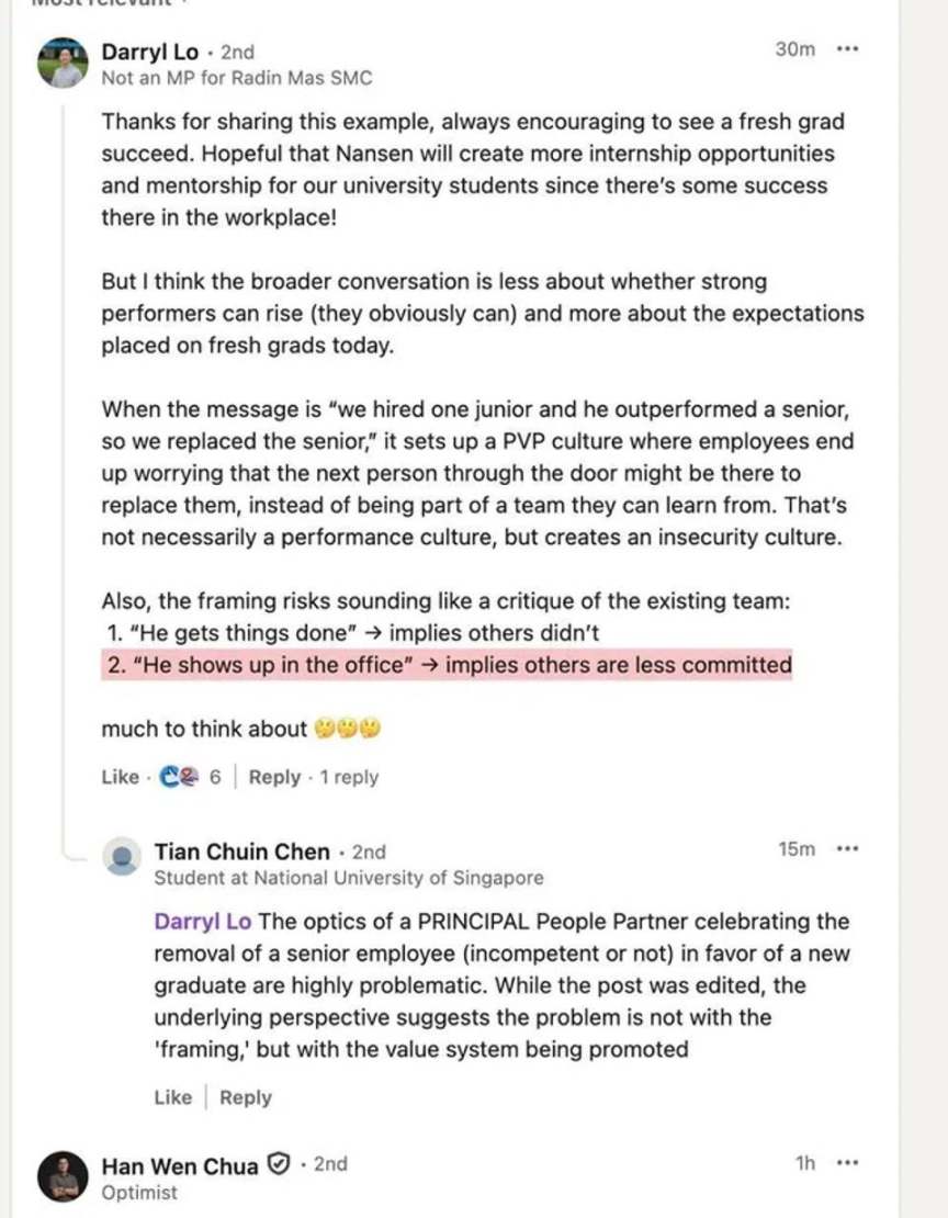 这篇原始帖子在 LinkedIn 上同样引发了广泛批评。2025 年独立大选候选人达里尔·罗(Darryl Lo)评论道,虽然「看到一位应届毕业生取得成功令人鼓舞」,但更大的问题在于,这篇帖子似乎是在鼓吹一种以不安全感为驱动的职场文化。