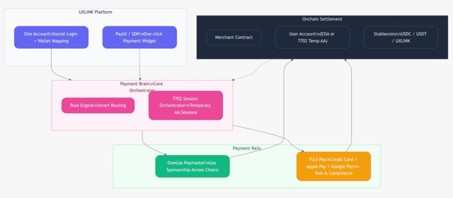 核心目标:让用户只需使用 UXLINK 或 USDT/USDC 等核心资产即可在任何链上完成支付,无需管理各链的原生 gas 代币。