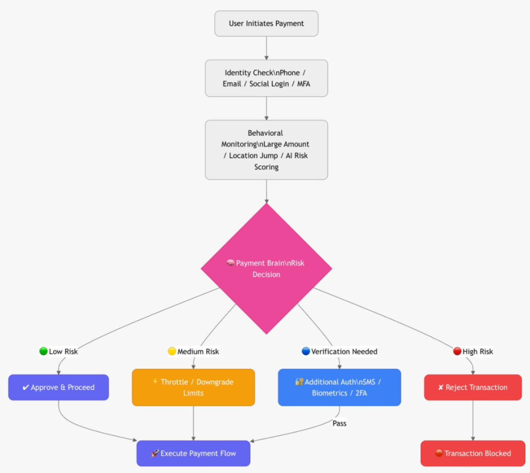 所有风控和合规验证结果都会反馈到支付大脑的核心,根据风险等级实施差异化处理: