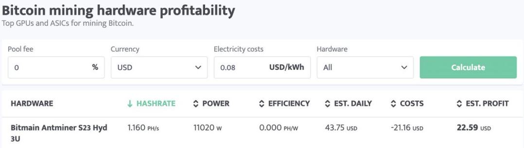 当前最新款 BTC 矿机每日收益 ~$23,静态回本周期约 3.4 年