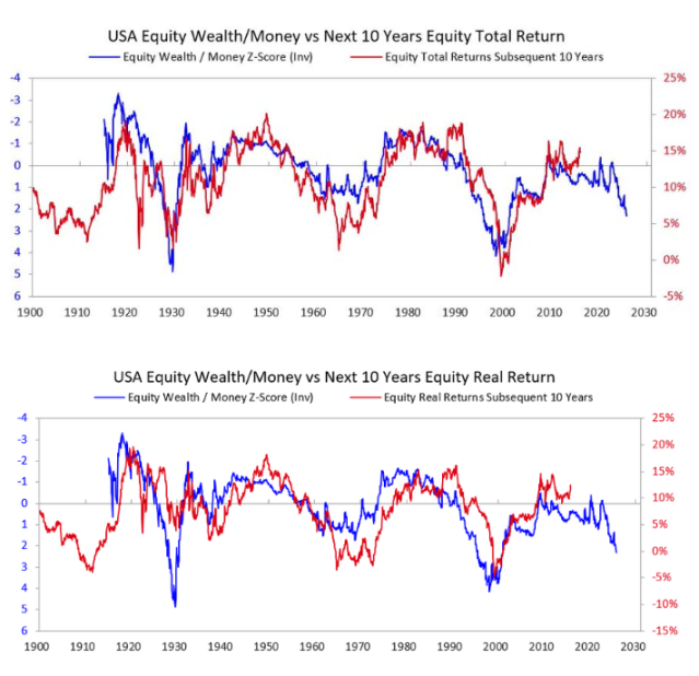接下来的两张图表展示了该读数如何预示未来 10 年的名义和实际收益率。这些图表本身已说明问题。