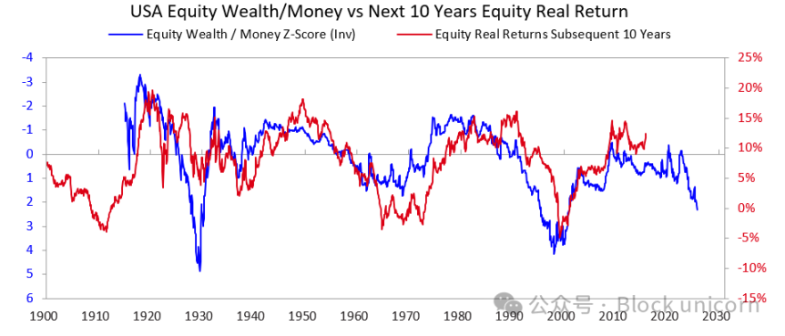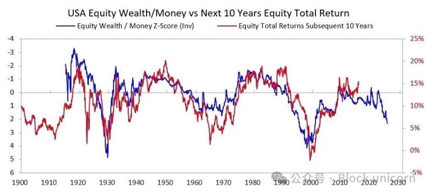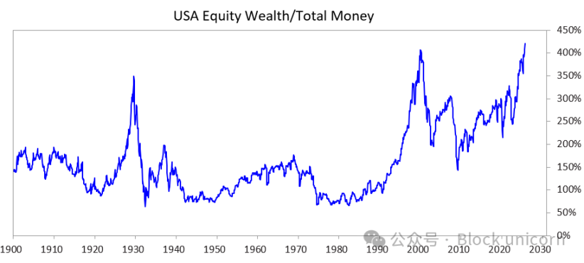 为了探究这种伴随巨大贫富差距而来的动态如何刺破泡沫,并导致一场可能在社会、政治和金融领域造成严重破坏的崩盘,我研究了下面的图表。该图展示了过去和现在的财富 / 货币差距,以及股票总市值与货币总量的比例。