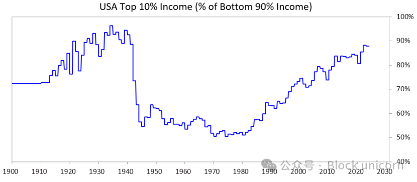 下图显示了收入最高的 10% 人群相对于收入最低的 90% 人群的收入占比——你可以看到现在的差距非常大。