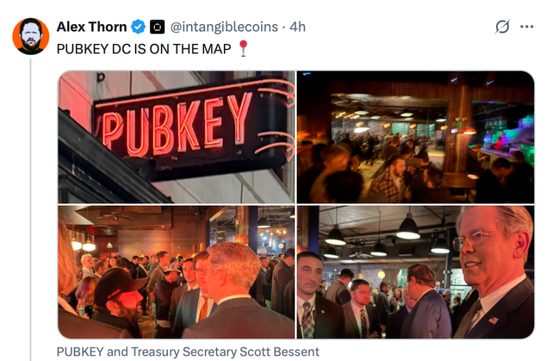 此次贝森特造访的地点本身具有一定的政治象征意义。位于华盛顿的这家 Pubkey 是纽约同名场所的姐妹店,作为总统候选人的特朗普在该机构的一家门店进行了竞选停留,使得该品牌成为连接政治与加密货币文化的一个独特节点。