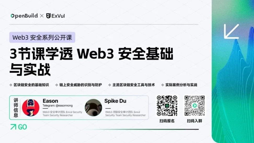 为帮助初学者全面了解区块链安全的理论与实践,OpenBuild × Exvul 联手,特别设计了一套系统的公开课系列——Web3 安全基础与实战课程。这个系列课程将逐步带领大家从基础安全理论到实际案例分析,开启您的区块链安全之路!