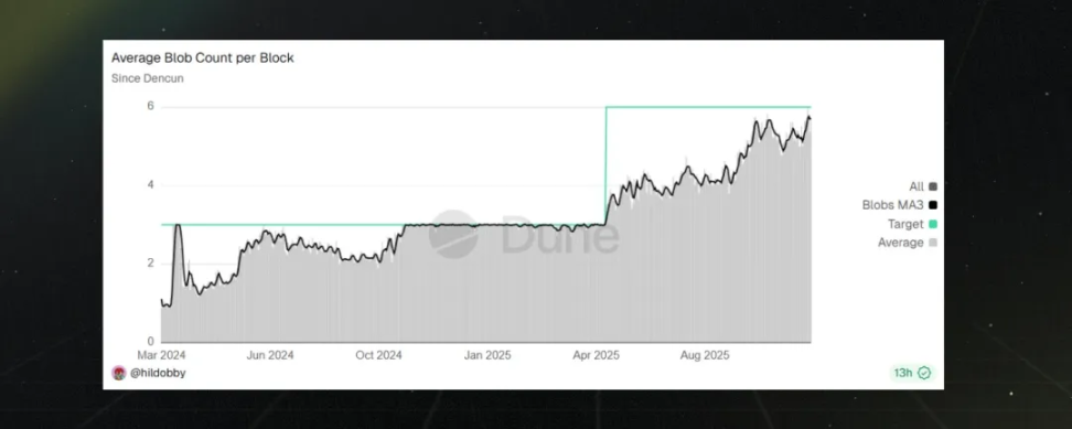 以太坊每区块 Blob 数量接近 6 个目标值