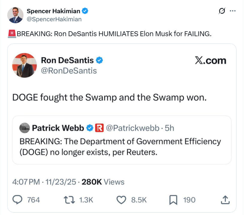 佛罗里达州州长罗恩·德桑蒂斯(Ron DeSantis)在社交平台 X 上评论称:「DOGE 与 Swamp(沼泽,暗指政府腐败、官僚主义)作战,但 Swamp 赢了。」这番言论,无疑将 DOGE 的终结解读为一次标志性的失败。