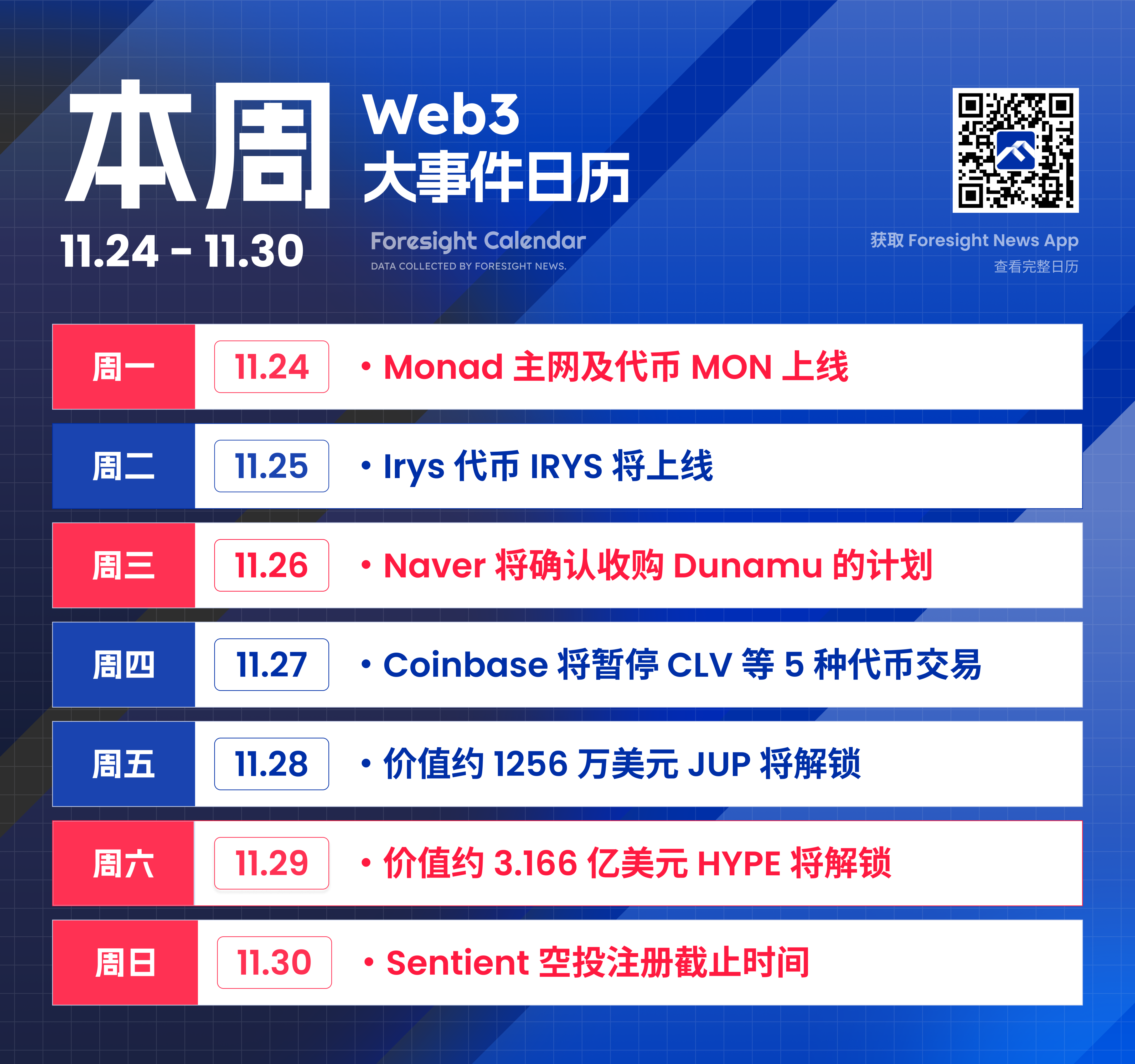 本周(2025 年 11 月 24 日 - 11 月 30 日)Web3 大事件不容错过,下图是本周精彩预告: