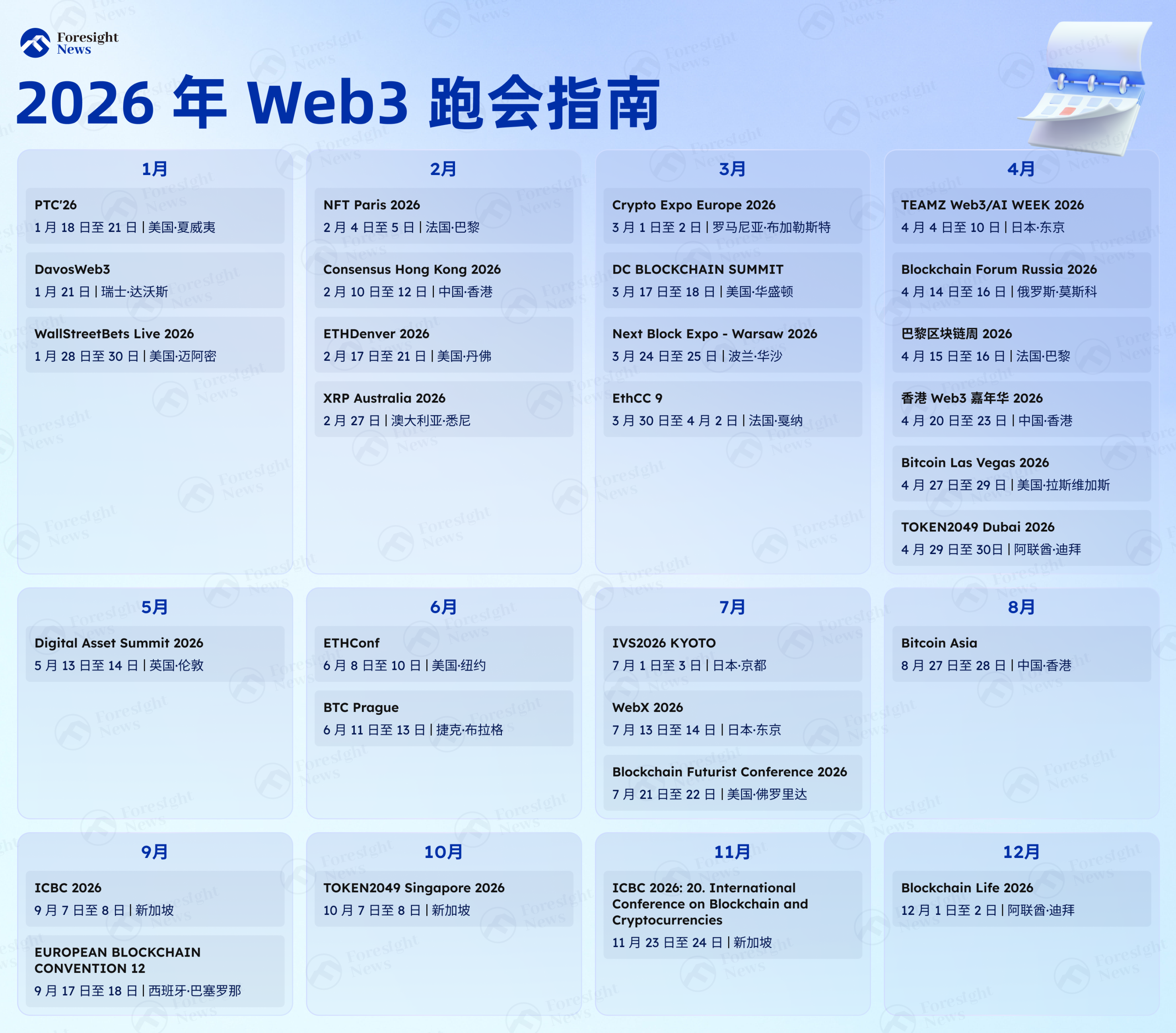 值得关注的是,2026 年的会议布局更加均衡,从地理分布到时间安排都体现了行业的全球化与成熟度。特别是亚洲地区的会议数量增加。Foresight News 将持续追踪并更新各大峰会信息,提供最新最全 Web3「跑会」信息。
