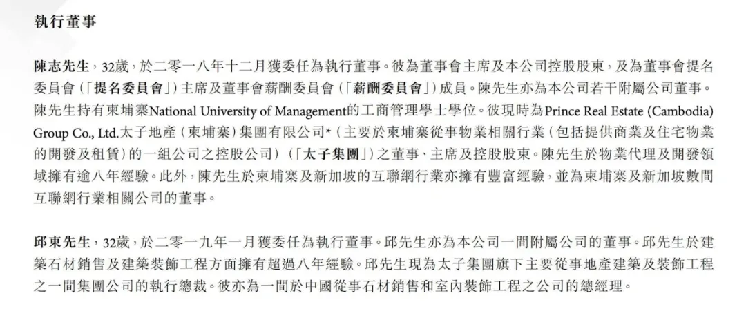 致浩达控股(01707.HK):原是一家香港本地工程承包商,2017 年 10 月上市。上市仅一年多后,原股东于 2018 年 12 月火速清仓退出,陈志接手全部股权,瞬间成为持股 54.79% 的绝对控股股东。入主当月陈志即出任执行董事,并引入其亲信、太子集团高管邱东共同担任董事。随后,公司业务开始 「柬埔寨化」,在维持香港工程主业同时,2019 年起拓展柬埔寨房地产开发,2023 年更介入奢侈品销售领域。陈志本人一度担任其奢侈品子公司董事,直至 2023 年中辞任。值得注意的是,即便今年 7 月陈志表面上辞去了致浩达职务,他控制的公司仍与致浩达有业务往来,例如致浩达承认为陈志旗下公司所持有的香港物业提供物管服务,且公司现金曾存放于陈志控股的太子银行。这说明陈志与上市公司的资金关联并未完全切割。