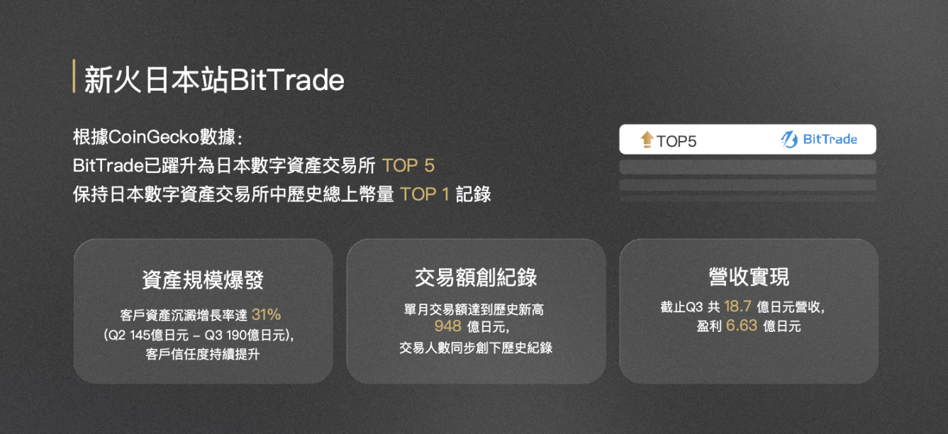 翁晓奇:我们发布了一整套的战略矩阵,除了香港的私行,还有新火日本。新火日本已经表现出了一个比较好的增长态势。我们日本的交易所叫 BitTrade,在 Coingecko 的排行是日本第五,而且历史总上币量排名第一,关键是它已经实现盈利了,截止今年 Q3,一共有 18.7 亿日元( 约 8976 万元 )的营收,盈利了 6.63 亿日元( 约 3024 万元)。