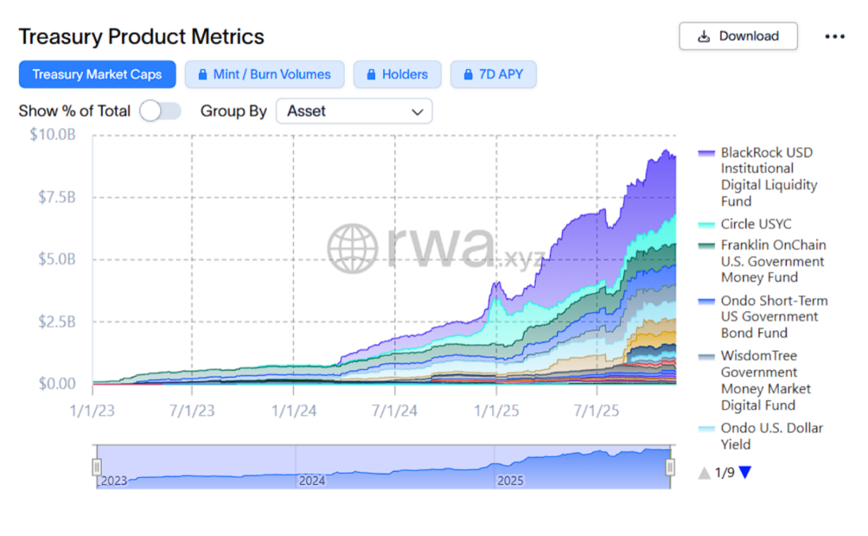 根据 RWA.xyz 公布的市场规模图表,代币化国债(Tokenized Treasuries)在 2023 年初不足 5 亿美元的基础上,持续增长至 2024 年的数十亿美元,并在 2025 年逼近百亿美元水平,由 BlackRock、Franklin、Securitize 与 Ondo 等多家机构共同推动。这一增长并不意味着传统资产正在迁移上链,而更说明加密用户对链上获取链外收益结构的兴趣在提升,跨资产配置正在从平台界面延伸至链上层。