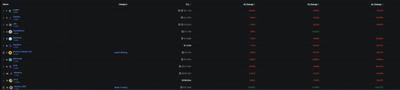 同期,Solana 链上的 TVL 也从 129 亿美元降至了 87.9 亿美元,降幅与 USDC 的供应量相似。而 Solana 排名靠前的 DeFi 协议在这一阶段同样经历了 TVL 的大幅下降。从这一角度来看,在 10 月 11 日市场暴跌之后,Solana 链上有大批资金选择将稳定币直接赎回以规避市场风险。