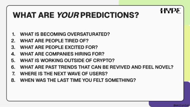保持领先的关键在于:把握领域脉搏、从加密圈外汲取灵感、并坚持第一性原理思考。以下问题有助于形成你自己的预测和营销策略: