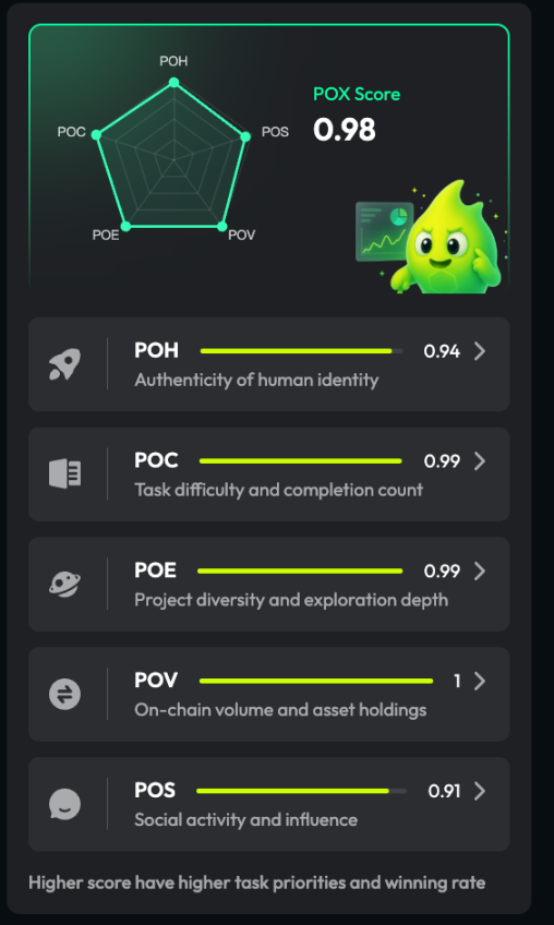 同时,TaskOn 上线了全新的 POX 评分系统围绕五个维度进行用户身份和参与行为进行交叉评分: