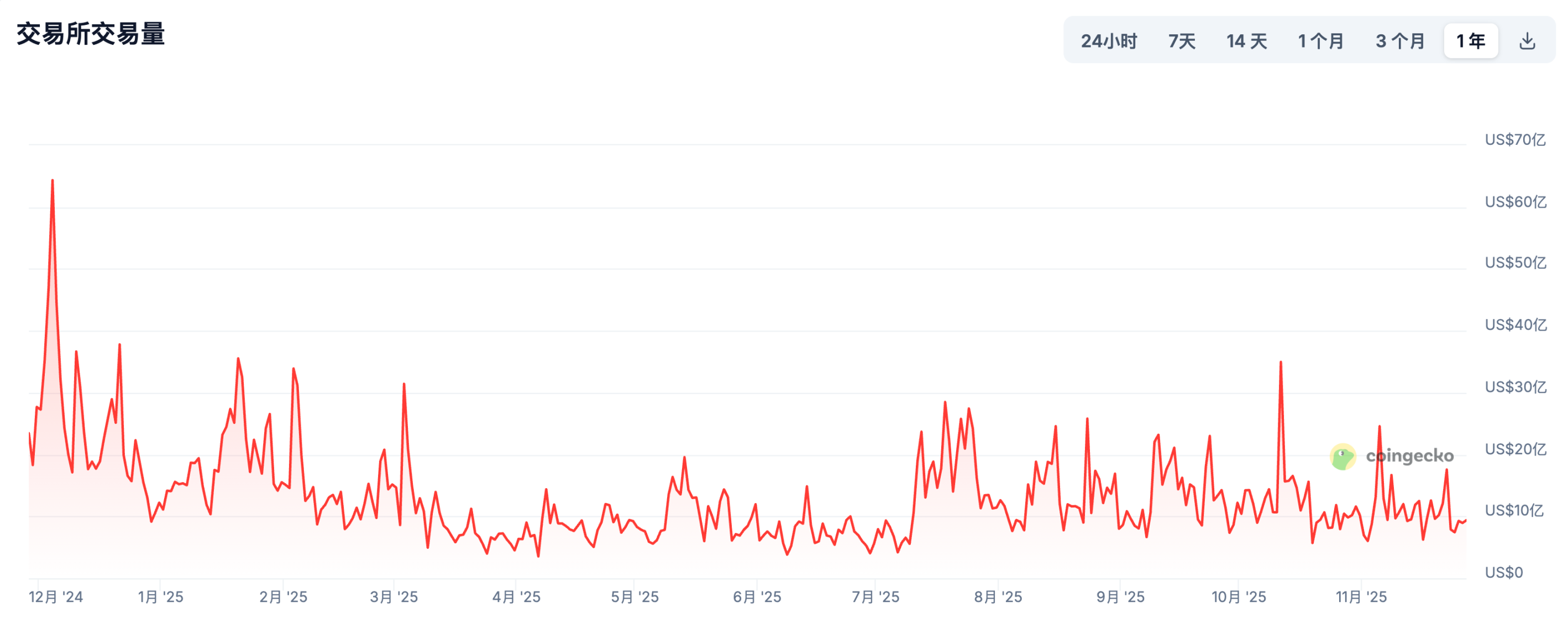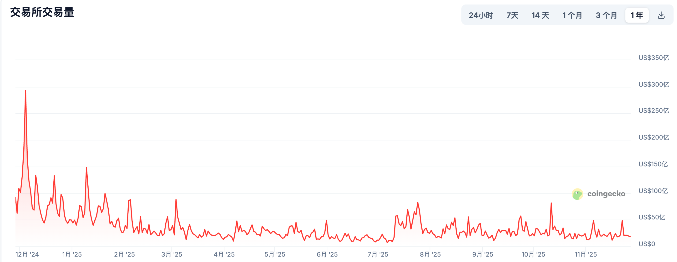 更值得关注的是整体市场热度的变化——交易量指标较去年大幅下滑。2024 年底韩国加密市场曾出现一波疯狂行情:据统计,2024 年 12 月 3 日 Upbit 单日成交额飙升至 274.5 亿美元,创下历史峰值,约为平日水平的十倍。然而,这一「疯狂之夜」过后,市场情绪急转直下,2025 年进入降温通道。2025 年 11 月 Upbit 日均交易额仅约 17.8 亿美元,较 2024 年末的高点暴跌了 80%。其交易量已连续四个月下降,并趋于在 20 亿~40 亿美元区间窄幅波动。