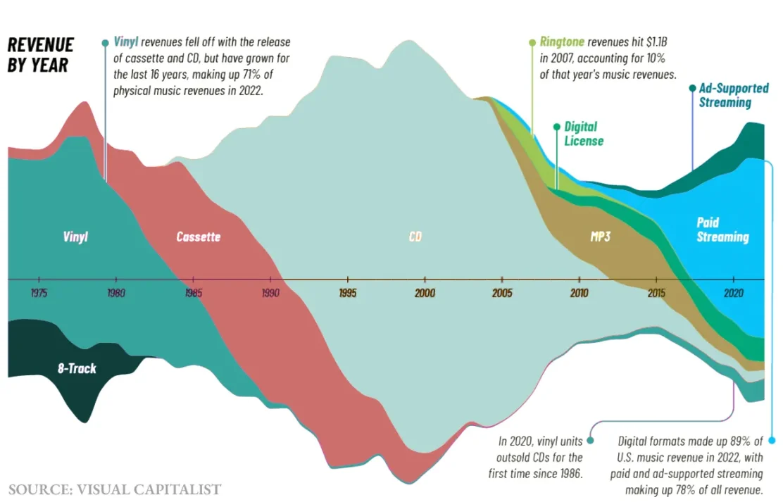 然后当 iPhone 问世时,基础设施再次改变。廉价的云存储、4G 和全球 CDN 使得访问任何歌曲即时且流畅。手机始终在线,瞬间接入无限数量的歌曲。流媒体在接入层重新捆绑了一切:每月 9.99 美元即可收听所有已录制的音乐。