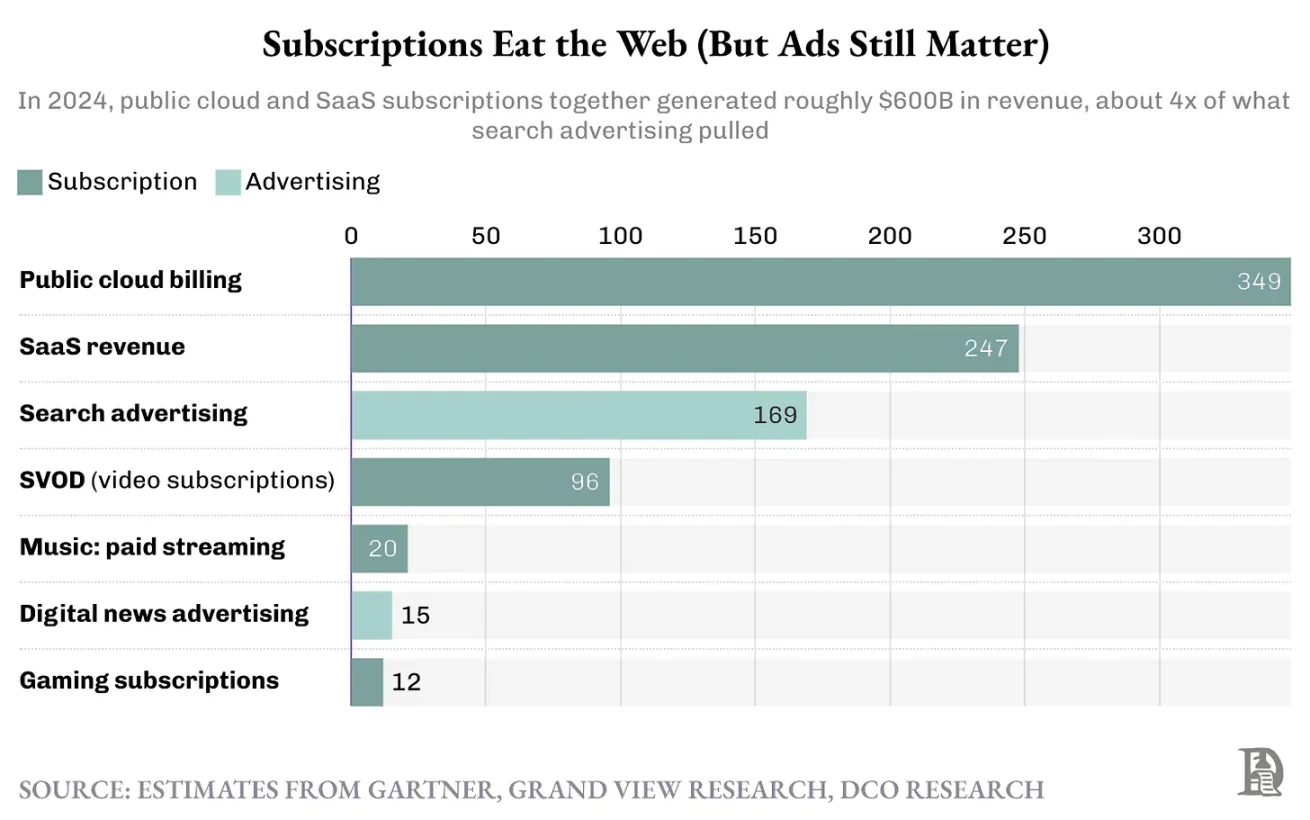 这之所以有效,是因为人类注意力遵循模式。我们大多数晚上看 Netflix;我们每周从亚马逊订购;Prime 会员捆绑包包含送货、退货和流媒体服务,每年 139 美元。订阅消除了许多持续的痛苦。亚马逊现在向订阅用户推送广告以提高利润率,迫使用户要么观看广告,要么支付更多费用。当聚合者无法证明订阅的合理性时,他们就会像谷歌一样退回到广告模式,后者将注意力而非意图货币化。